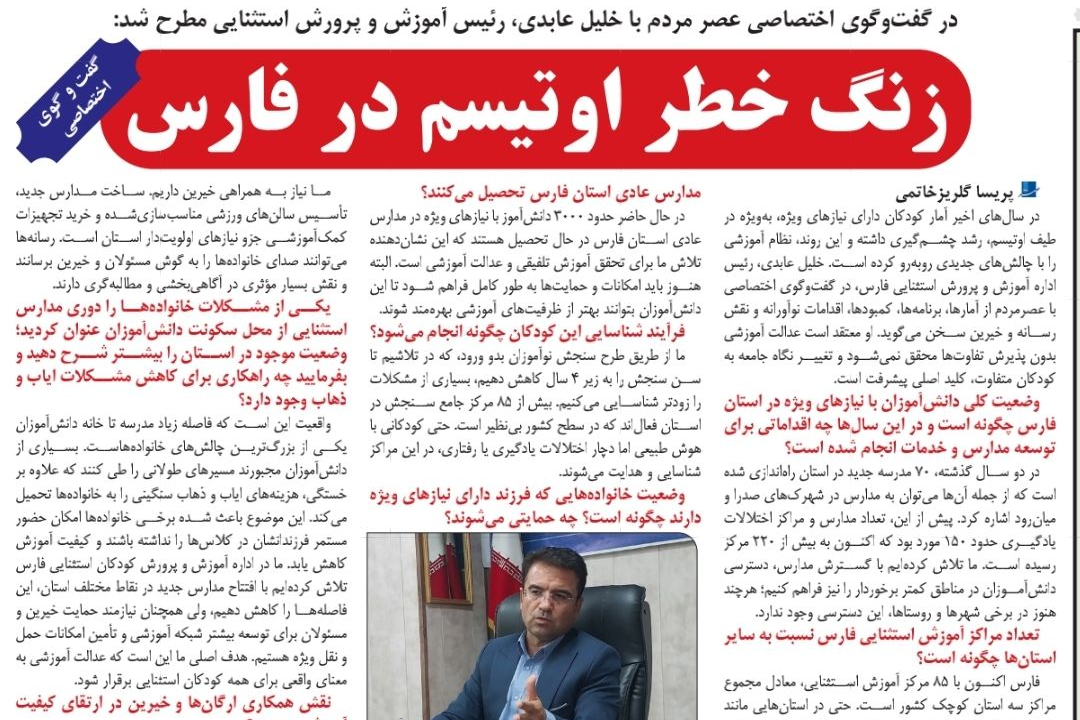 صحبت های رئیس آموزش و پرورش استثنایی استان فارس با روزنامه عصر مردم
