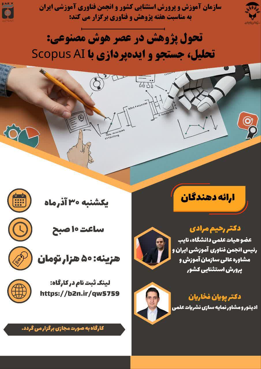 به مناسبت هفته پژوهش سازمان آموزش و پرورش استثنایی کشور با همکاری انجمن فناوری آموزشی ایران، کارگاه تخصصی با عنوان «تحول پژوهش در عصر هوش مصنوعی: تحلیل، جستجو و ایدهپردازی با Scopus AI» برگزار میکند.