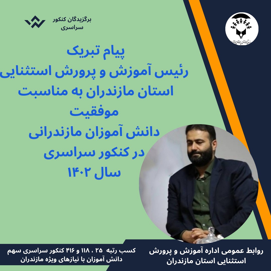 پبام تبریک رئیس آموزش و پرورش استثنایی استان مازندران به برگزیدگان کنکور سراسری ۱۴۰۲
