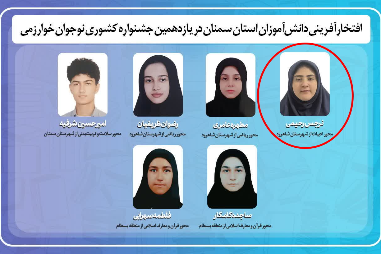 درخشش دانش‌آموزان سمنانی در جشنواره ملی خوارزمی؛ نرجس رحیمی رتبه اول کشوری در محور ادبیات را کسب کرد.