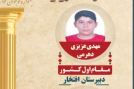 دانش آموزان توانمند مدرسه افتخار ، آقایان" مهدی عزیزی دهرمی" و "علی اصغر جعفری" با کسب مقام اول کشوری در محور فعالیت های آزمایشگاهی در یازدهمین دوره جشنواره نوجوان خوارزمی مقام اول کشوری را از آن خود کردند.