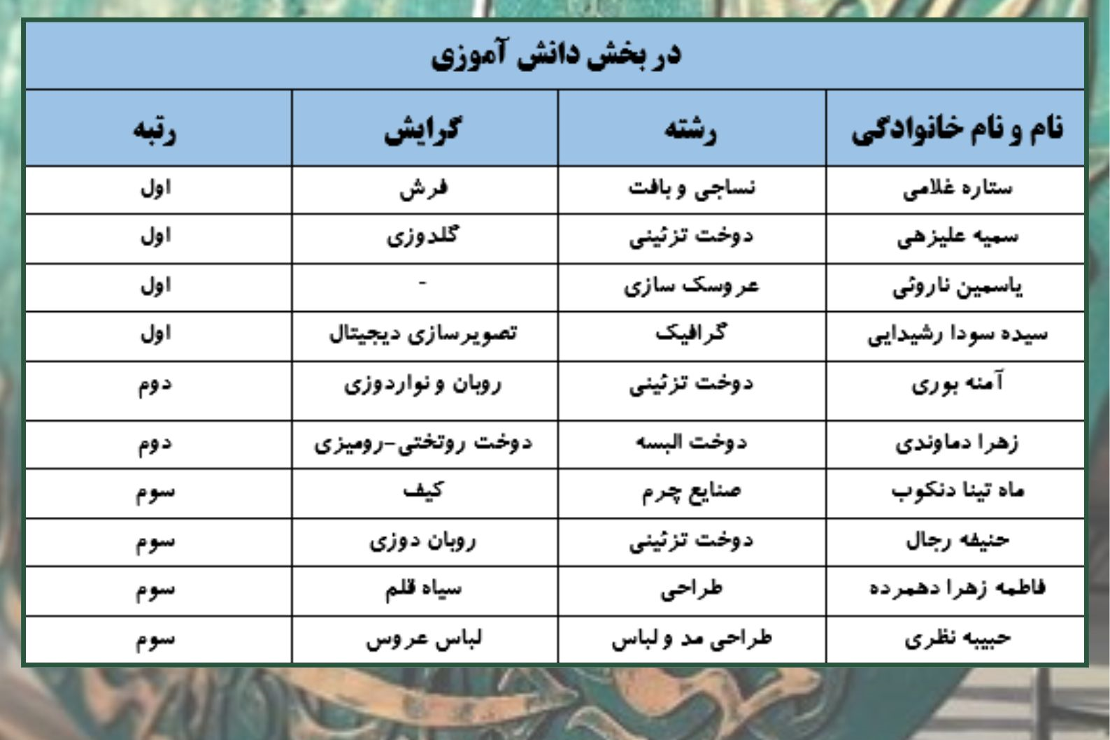 درخشش نمایندگان استان در بخش دانشآموزی بسیارچشمگیر بود؛ به طوری که مقام اول کشوری به ستاره غالمی در رشته فرش، سمیه علیزهی در رشته گلدوزی، یاسمین ناروئی در رشته عروسک سازی و سیده سودا رشیدایی در رشته تصویرسازی دیجیتال تعلق گرفت. همچنین، آمنه بوری در رشته روبان و نواردوزی و زهرا دماوندی در رشته دوخت روتختی-رومیزی موفق به کسب مقام دوم شدند و رتبههای سوم کشوری نیز به ماه تینا دنکوب در رشته کیفچرم، حنیفه رجال در رشته روبان دوزی، فاطمه زهرا دهمرده در رشته سیاه قلم و حبیبه نظری در رشته طراحی مد و لباس رسید.