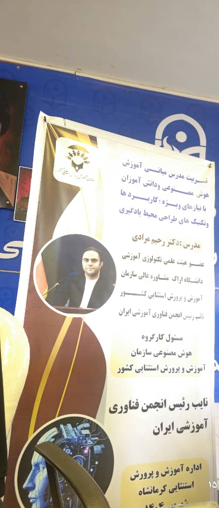 به گزارش روابط عمومی و امور بین‌الملل سازمان آموزش و پرورش استثنایی کشور به نقل از  روابط عمومی اداره آموزش و پرورش استثنایی استان کرمانشاه، کارگاه تربیت مدرس میانی هوش مصنوعی روز پنجشنبه ۲۷ شهریورماه در پردیس شهید رجایی دانشگاه فرهنگیان، به همت کارگروه هوش مصنوعی سازمان آموزش و پرورش استثنایی و با همکاری اداره آموزش و پرورش استثنایی استان کرمانشاه برگزار شد. این کارگاه با حضور رحیم مرادی مشاور رئیس سازمان و دبیر کارگروه هوش مصنوعی به‌عنوان مدرس دوره برگزار گردید.