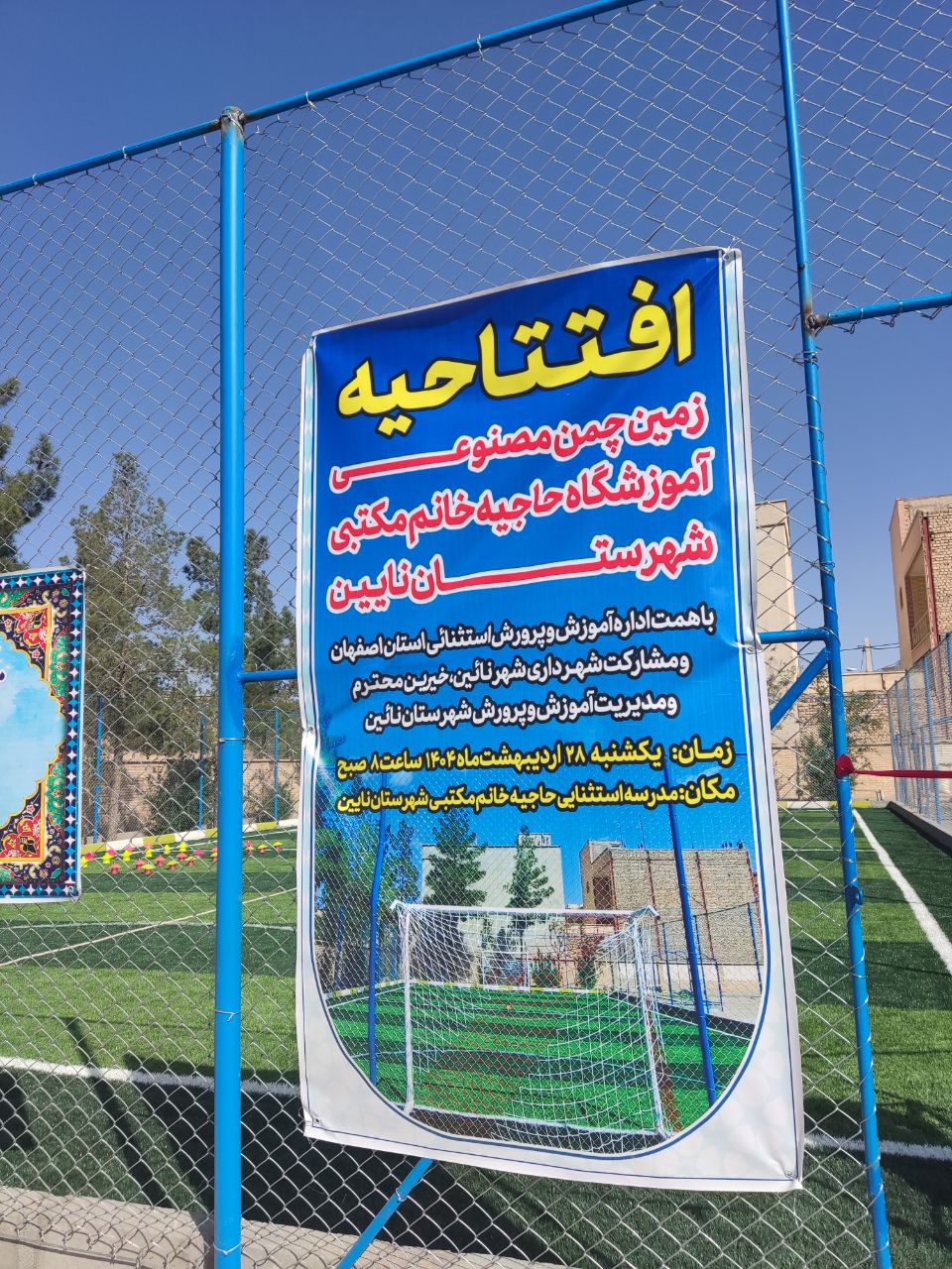به گزارش روابط عمومی اداره آموزش و پرورش استثنائی استان اصفهان؛ در بیست و هشتمین روز از اردیبهشت ماه سال ۱۴۰۴، زمین چمن مصنوعی آموزشگاه استثنایی حاجیه خانم مکتبی شهرستان نائین در ابعاد400متر مربع جهت بهره مندی دانش آموزان با نیاز های ویژه ، با حضور زهرا قجاوند رئیس اداره آموزش و پرورش استثنائی استان، شهریاری مدیر آموزش و پرورش شهرستان نائین، امام جمعه و کارشناسان استان،... افتتاح گردید. این پروژه با اعتباری بالغ بر 000/000/000 /4ریال ( 000/000/000 /2ریال آن از سوی سازمان آموزش و پرورش استثنائی و مابقی به کوشش اداره آموزش و پرورش استان؛ شهرداری و خیرین محترم منطقه) تامین و به بهره برداری رسید.
