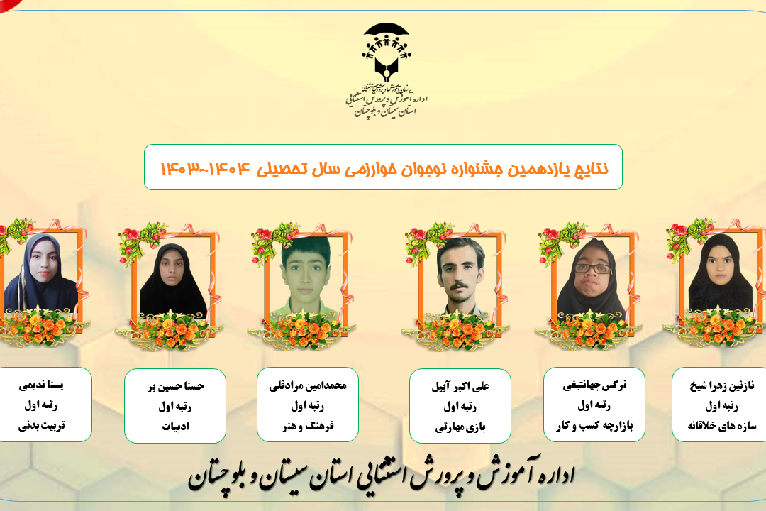 در این مرحله از جشنواره دانشآموزان محمد امین مرادقل در محور فرهنگ و هنر از آموزشگاه پویش شهرستان زابل، نرگس جهانتیغی در محور بازارچه کسبوکار از آموزشگاه حدیث زاهدان، علیاکبر آبیل در محور بازیهای مهارتی از آموزشگاه پویا زاهدان، نازنین زهرا شیخ در محور دستسازههای خلاقانه از آموزشگاه نگین زابل، حسنا حسینبر در محور ادبیات و یسنا ندیمی در محور تربیتبدنی از آموزشگاه نگاران سراوان رتبههای اول را از آن خود نمودند و به مرحله کشوری جشنواره راه یافتند.